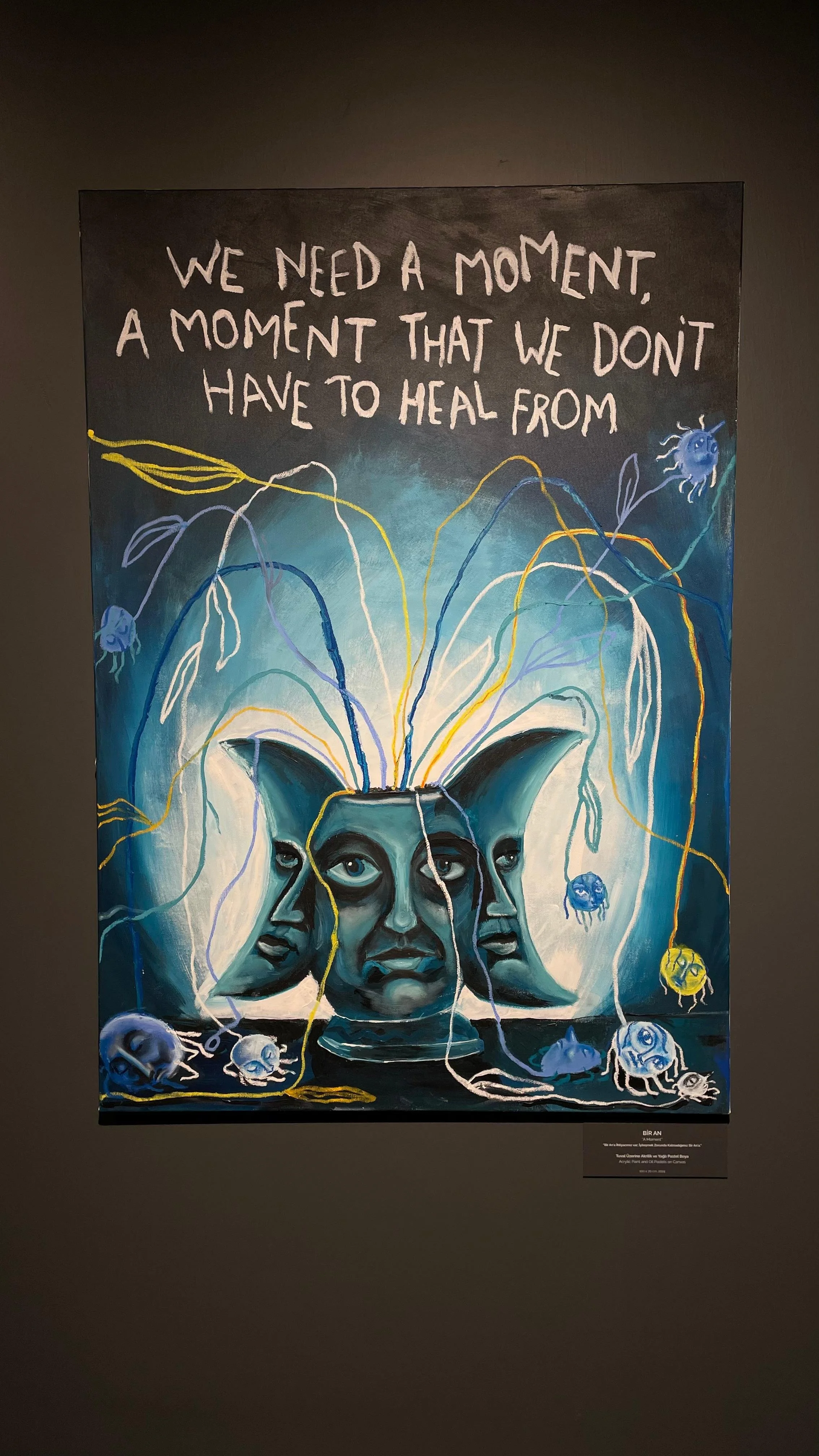 Yarattığı şeylerde her defasında bambaşka şeyler bulmaktan da mutlu oluyorum. Bazen aynı şeyi farklı zamanlarda gözlemlediğimde farklı anlamlar çıkarabiliyorum çünkü ben de zamanla başkalaşıyorum. Bir başkasıyla aynı şeye bakıp farklı şeyler görmekse beni, onu ve büyük oranda bizi çok zenginleştiriyor bana kalırsa. Bu sergide de en beğendiğim şey neredeyse eserlerinin tümünde kullandığı, karikatürize ettiği o karakter ve onun yalınlığı. Sizlerin de gözlemleyebileceği gibi kıyafetsiz, saçsız, üzerinde materyal hiçbir şey olmayan, hatta belki de cinsiyetsiz olan bu karakter aslında çok arınmış bir personayı anlatıyor bize. Belki de bu bağlamda iç dünyasına daha çok girebiliyoruz o karakterin, kendi iç dünyamızla bağdaştırırken çok da zorlanmıyoruz, kendimizi benzetmeye çalışmıyoruz. Hatta daha sonrasında 2 veya daha fazla öznesi olan eserlerde farklılaştırmak için başka renkler kullandığını fark ettim ve bu noktada hissettiğim şey aslında bambaşka insanlar olsak da birbirimizden çok da uzak olmadığımız ve nereden baktığınıza bağlı olarak bir araya geldiğimizde çok güzel bir çeşitlilik, karakterlerimizle çok güzel bir renk paleti yarattığımız oldu. O eserden aldığım şeyler beni çok mutlu etti çünkü bütün benliğimle kabul edilebilir, insanlarla kaynaşabilir, farklılıklarımla var olabilirmişim gibi hissettirdi.